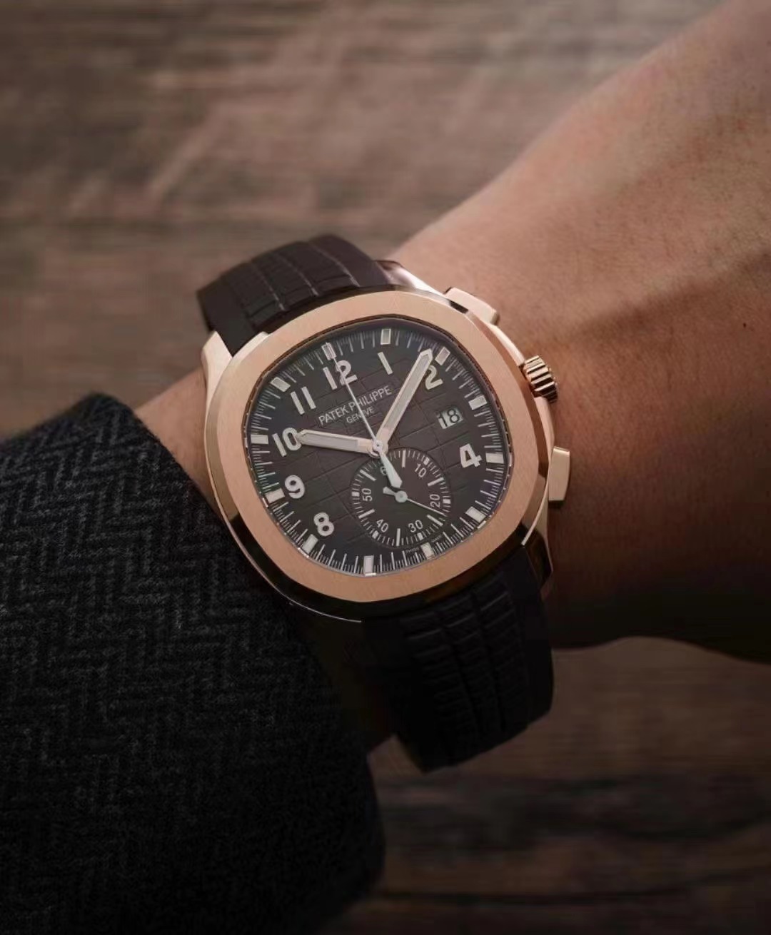表盘材质:棕色日辉纹表盘,边缘呈黑色渐变效果,饰有Aquanaut浮雕图案,搭配覆白色荧光涂层的金质立体字块。