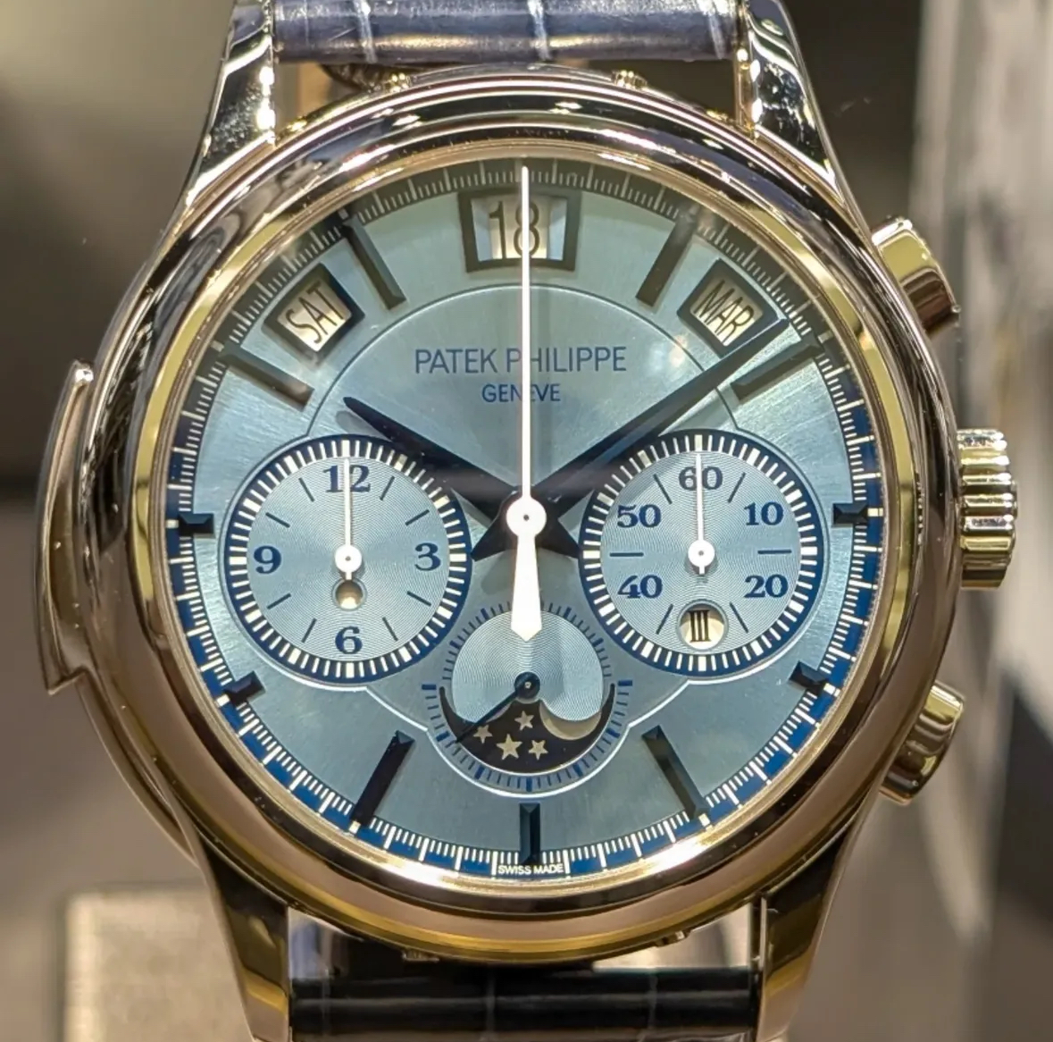 简介:新款四重复杂功能腕表 Ref. 5308G-001 配备优雅的冰蓝色日辉纹表盘,与蓝色金属喷镀处理的白金琢面立体时标和琢面剑形指针相得益彰。