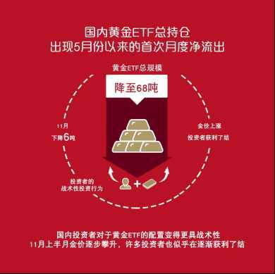 *2014年4月之前使用的是Au9999与伦敦早盘金价(LBMA)对比。详情请点击世界黄金协会官网Qaurum[5]。 国内黄金ETF持仓经历了自5月以来的首次月度净流出 随着去年金价的强劲上涨势头逐步冷却,国内投资者对于黄金ETF的配置变得更具战术性,11月上半月金价逐步攀升,许多投资者也似乎在逐渐获利了结: