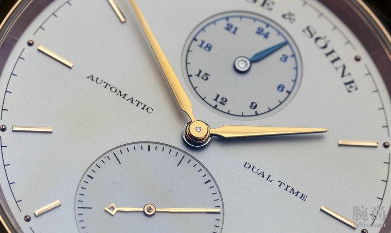 很多人都喜欢朗格采用的蓝钢实心表针的设计。金针和蓝钢针对比也非常明显,易于辨识。表盘的表面处理也是完美的,两个小表盘和主表盘之间的小反差让人很喜欢。 你会注意到,为了保持平衡,表盘中间左右文字是AUTOMATIC 和 DUAL TIME,不知你注意到了吗?包括空格在内,两边字母数字相同,这就能保持表盘平衡之美!