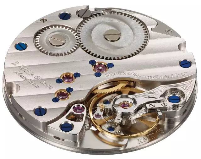 首先映入眼帘的就是经典的3/4夹板。与传统的格拉苏蒂夹板类似,莫勒的3/4夹板也覆盖了弹簧条盒轮、表冠以及整个齿轮传动系统。不同的是,莫勒还有一块可移动的擒纵轮夹板,方便擒纵轮和擒纵系统可以更加容易地被移动和清洗。在RMK 01上还能清楚看到3个美丽的黄金套筒,每个黄金套筒都配有3颗单独的蓝钢螺丝固定,与里面的红宝石一起,在夹板上显得熠熠生辉。更值得关注的,还有莫勒拥有独家专利技术的“啄木鸟微调装置”