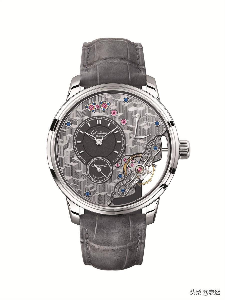 本款腕表搭载42毫米抛光/缎面磨砂铂金表壳,一条精美的激光雕刻黑色镀铑天际线贯穿四分之三夹板和蝴蝶桥板表面,并延续至腕表背面。蓝宝石水晶玻璃表镜和表底盖以及部分镂空的机芯设计给腕表鉴赏家们呈现了一场街头艺术的视觉盛宴。Calibre 66-12型手动上链机芯以4赫兹的频率稳定振动,运行时间长达41小时,螺丝固定式黄金套筒、红宝石轴承、蓝钢螺丝、倒角边缘、抛光钢质零件等充分体现格拉苏蒂原创的德系高级制表特征。