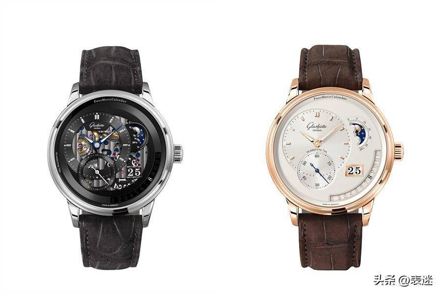 两个表款的时分和小秒盘均采用品牌标志性的不对称显示,月相盘位于2点钟位置,透过3点钟和6点钟位置之间的弧形蓝宝石水晶玻璃窗,颇具创意的月份显示与其相映成趣。此外,格拉苏蒂原创独有的大日历显示位于4点钟位置,其金色边框首度在红金表款中亮相。