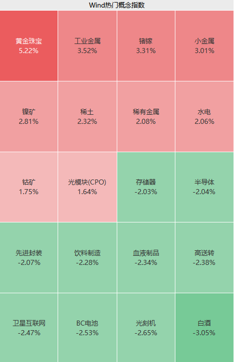 盘面上,上午有色金属领涨市场,黄金珠宝、工业金属、镍矿、稀土、钴矿等概念全线走高,汽车、电力、油气、钢铁等板块存在局部行情。白酒股不振,光刻机、BC电池、血液制品等概念走低。