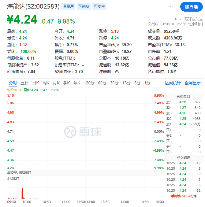 4月8日上午,海能达在竞价阶段即走出一字跌停,股价低至4.24元/股,跌幅9.98%。截至发稿,海能达卖一封单超31万手。