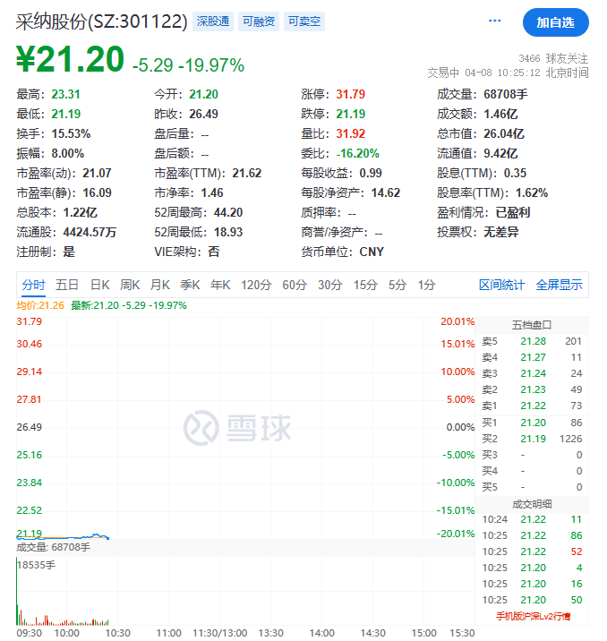 4月8日上午,采纳股份开盘即走出20CM跌停,股价来到21.19元/股。截至发稿,采纳股份短暂撬开跌停,但仍挣扎在跌停线附近。