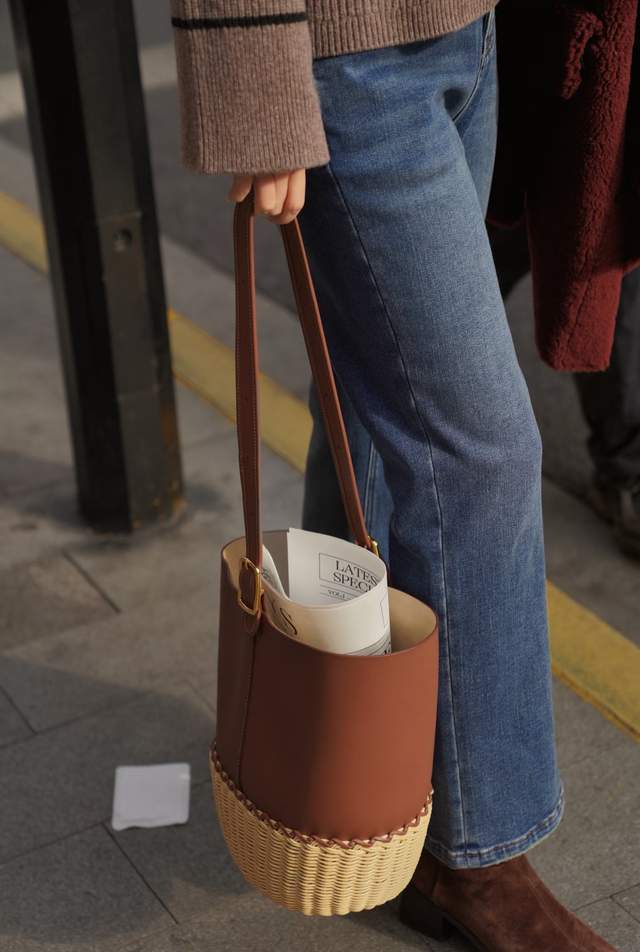 也不是说当你选对一款包包,就会让自己变得高级,比如,你的穿衣打扮,衣服色彩和裤子色彩过于艳俗,就算手里提的很昂贵的包,同样也会显得土气。 所以,我们想让自己变得高贵典雅,一定要注重每个穿搭细节,例如,上图右边这位女士用经典的红色毛衣搭配黑色半身裙,脚上穿的一双棕色的短靴,再用黑色的单肩包来点缀,“红黑”配色就显得经典高级。 第二章节:职场女性应该如何搭配包包,显得通勤时髦tips①棕色水桶包