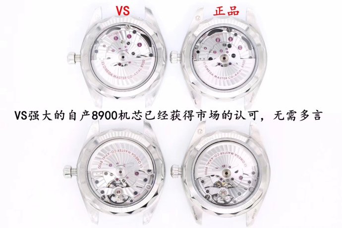 VS厂出品欧米茄海马150米柚木系列采用是8900机芯,跟正品一样,都是采用8900机芯,还有这里说一下8900机芯跟8500机芯一样,都是一体机芯,只是在摆陀上刻字不同。欧米茄海马系列机芯8400,8500,8507、8508包括8605带有GMT功能的机芯都是由8500基础机芯演化而来,也是VS的这枚8500一体机芯的亮点,虽然说采用有卡度来调节误差,区别仅此而已。并且这款腕表底盖边缘采用的是拉丝工艺,之前都是采用抛光工艺。